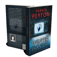 “A retro TV with a hand silhouette on the screen is above the title "Winter Phantom" in a mysterious, dark design.”