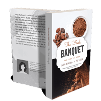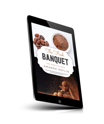“An image showing cocoa beans, a bowl of cocoa powder, and chocolate truffles with a book cover design "The Fresh Banquet" by Amanda Heflin.”