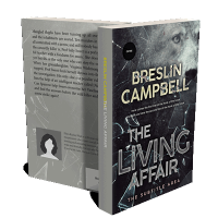 “A book cover featuring the title "The Living Affair" with a cracked glass design and an abstract background.”