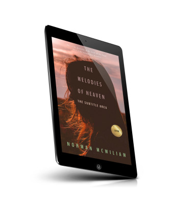 “Silhouette of a woman in a field against a sunset, featuring a book cover design.”