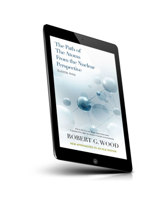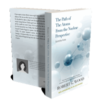 “A book cover with abstract atomic design in light blue, featuring spheres and connecting lines, and text about atoms and nuclear perspective.”