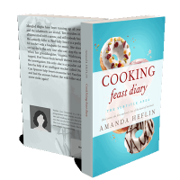 “Four decorated donuts against a turquoise background with the text "COOKING feast diary" and an author's name.”