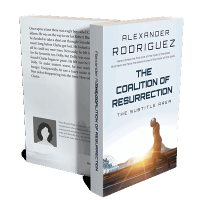 “A person in a spacesuit walking with a sunset and a futuristic landscape in the background. Book cover with title and author's name.”