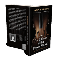 “Close-up of a violin's front with text above and below. Dark background enhances the instrument's rich wood texture.”