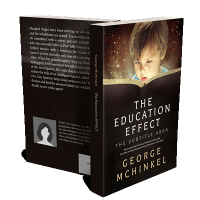 “A child intently reads a large book surrounded by a mystical, starry background. The book's title and author's name are prominently displayed.”