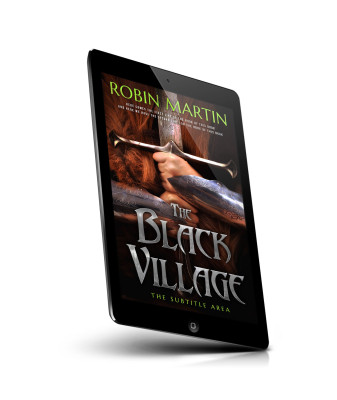 “A person in armor grips a sword, set against a dark backdrop. The title "The Black Village" is prominently displayed.”