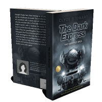 “A powerful steam locomotive emerges from smoke, with bold, dramatic text overlayed, creating an intense and mysterious atmosphere.”