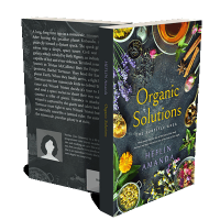 “An assortment of herbs and flowers arranged around a book titled "Organic Solutions" on a dark surface.”