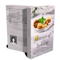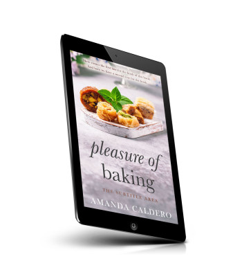“A variety of pastries on a white wooden board with greenery, set against a gray background. Book cover design.”