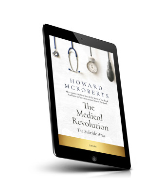 “A book cover with medical tools hanging above the title and author's name.”