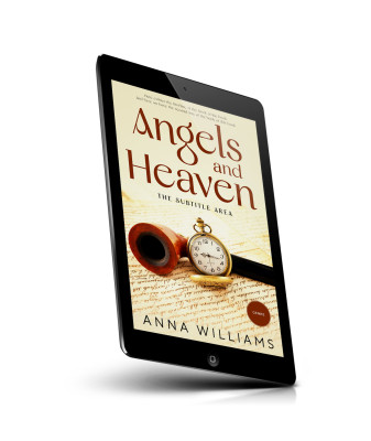 “A pocket watch and magnifying glass on handwritten papers with the book title "Angels and Heaven" and author's name "Anna Williams."”
