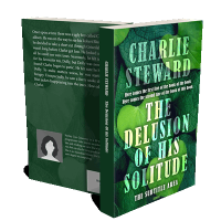“Green text on a leafy background promoting a book titled "The Delusion of His Solitude" by Charlie Steward.”