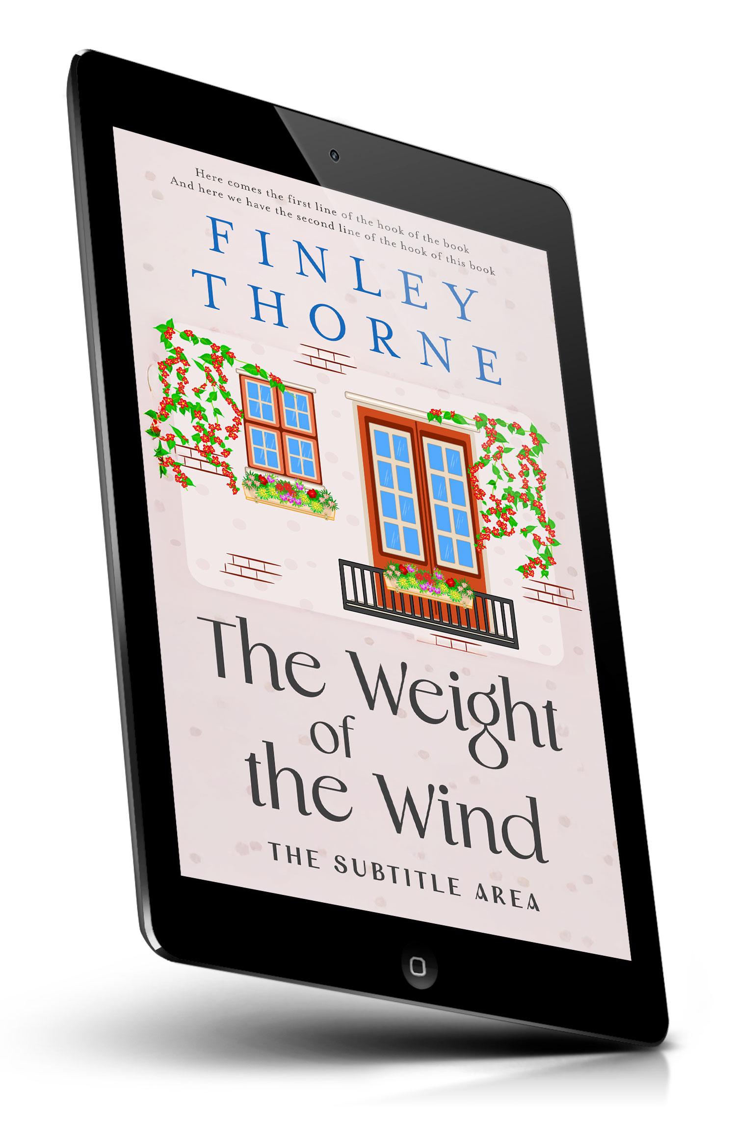“Illustrated building facade with blue-paned window and balcony doors, flower boxes, and red flowering vines climbing the walls.”