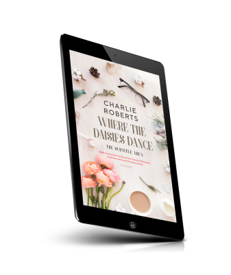 “A book cover with flowers, glasses, and a coffee cup placed on a white surface, creating a delicate, aesthetically pleasing arrangement.”