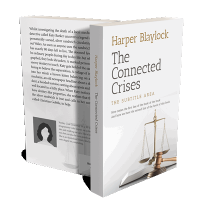 “A book cover with scales of justice, a gavel, and stacks of papers. Light beige background and large title text.”