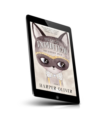 “An illustrated cat wearing glasses and a bow tie on a book cover titled "The Great Expedition".”