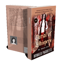 “A mysterious woman with long red hair and a red skirt stands in a mystical forest. The title "Burial of Whispers" is prominently displayed.”