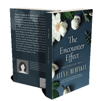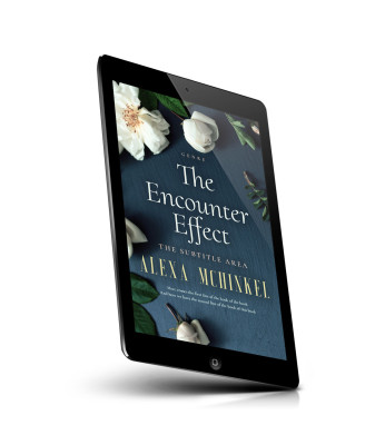 “A dark blue cover with white flowers and green leaves frames the title "The Encounter Effect" by Alexa Mchinkel.”