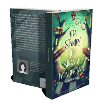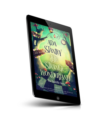 “Whimsical book cover with twisted trees, mushrooms, and colorful signs pointing to Wonderland, set in a dreamlike landscape.”