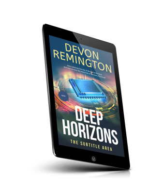 “Futuristic book cover with a microchip and digital elements on a blue and orange background. Title: Deep Horizons. Author: Devon Remington.”