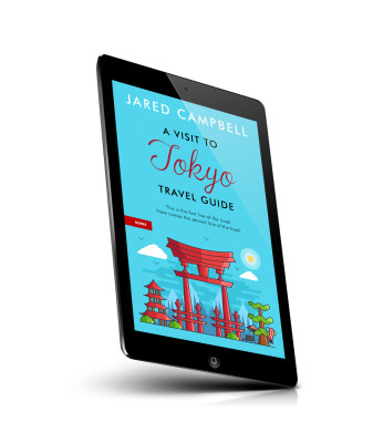 “A vibrant book cover for a Tokyo travel guide featuring pagodas, a Torii gate, and Mount Fuji with a blue sky backdrop.”