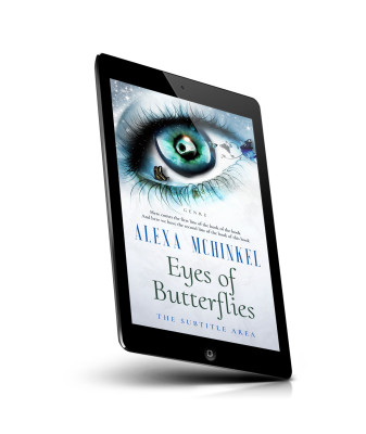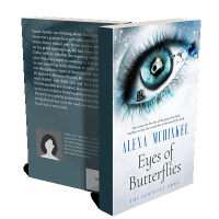 “Surreal eye with butterflies and sparkles, featuring a frosty theme and a vibrant iris.”