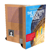 “The image features a book cover titled "The Ultimate Guide to Rome" with a picture of the Colosseum lit up at night.”