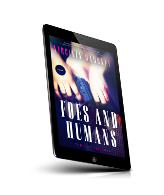 “A woman holding a gun against her thigh with a dark, moody background. The title "Foes and Humans" is prominently displayed.”