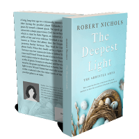 “A blue background with eggs in a nest, feathers, and branches, under a silver tray. The text above and below the featured title is not described.”
