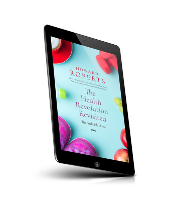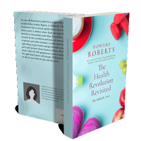 “A light blue background with exercise equipment, fruit, and a book cover titled "The Health Revolution Revisited."”