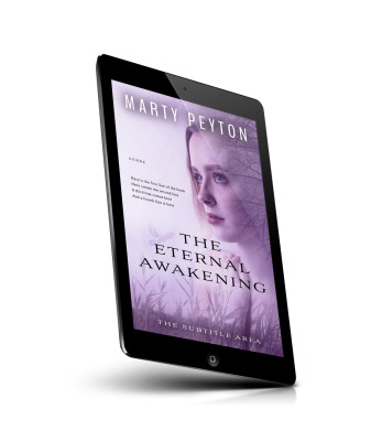 “Profile of a woman with long hair, in a purple-tinted setting with trees. Book title "The Eternal Awakening" is displayed.”