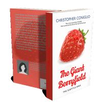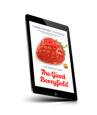 “An illustrated strawberry in 3D with water droplets, accompanied by text. The bottom features the book title in red script.”