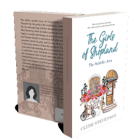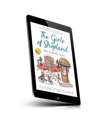 “Illustrated storefront with flowers and a bicycle in front, featuring the title "The Girls of Shopland" by Clyde Stevenson.”