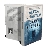 “A dark forest scene with a wolf in the center, beneath the title "Dark Secrets" and an author's name.”