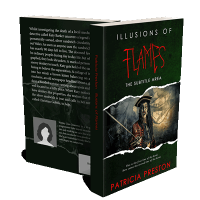 “A pirate with a long beard and hat holds a weapon, surrounded by a mystical, dark background. Book title: "Illusions of Flames."”