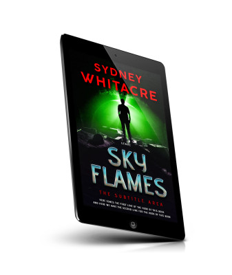 “A silhouetted person stands in a green-lit cavern. "Sky Flames" is prominently displayed below. The background suggests a sci-fi theme.”