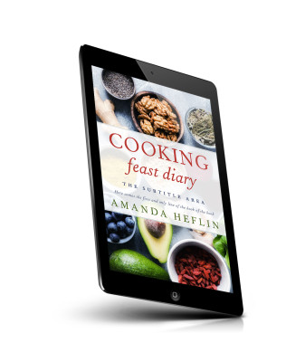 “A cookbook cover displaying various ingredients like walnuts, chia seeds, ginger, tea leaves, blueberries, avocado, and goji berries.”