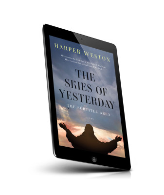 “A silhouette of a person with open arms stands beneath a dramatic, colorful sky. Title in large font.”