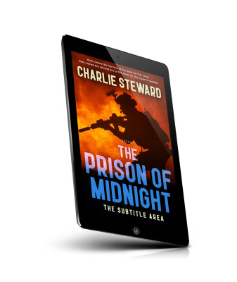 “A silhouetted soldier with gear against a fiery orange background, with bold blue and white text.”
