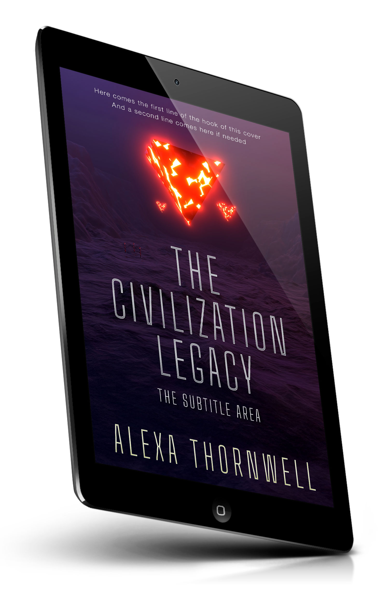Tags: science fiction, futuristic, alien artifact, glowing pyramid, floating monolith, mysterious lights, purple haze, dark landscape, barren terrain, distant figures, exploration, ancient ruins, cosmic, otherworldly, dystopian, sci-fi cover, neon glow, ominous, surreal, epic scale