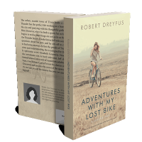 “A woman rides a bicycle across an open field, with a misty landscape in the background.”