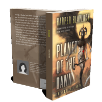 “A humanoid figure with wings and a sword stands against a fiery backdrop. The title "Planet of the Dawn" is prominent.”
