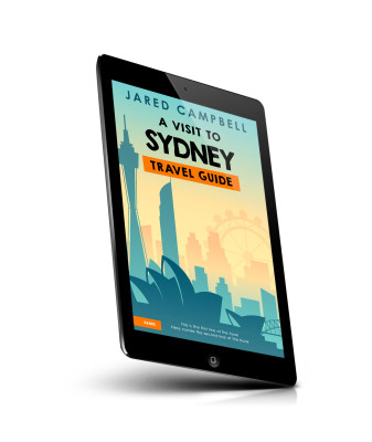 “Illustrated travel guide cover featuring Sydney landmarks like the Sydney Opera House and the Sydney Tower against a gradient sky.”