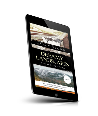 “An image of a book cover with feet resting, a mountain landscape, and the title "Dreamy Landscapes."”
