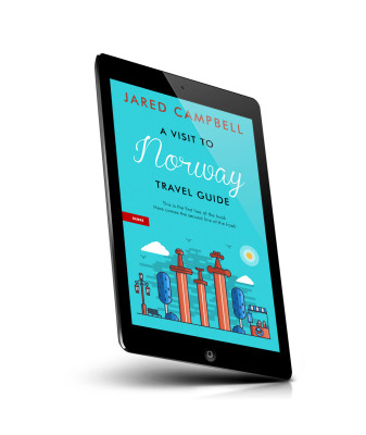 “Colorful travel guide cover with modern illustrations, showing Norwegian architecture, a lighthouse, and nature elements. Bright and inviting.”