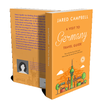 “Orange travel guide cover featuring a stylized drawing of Berlin's TV tower, trees, and buildings.”