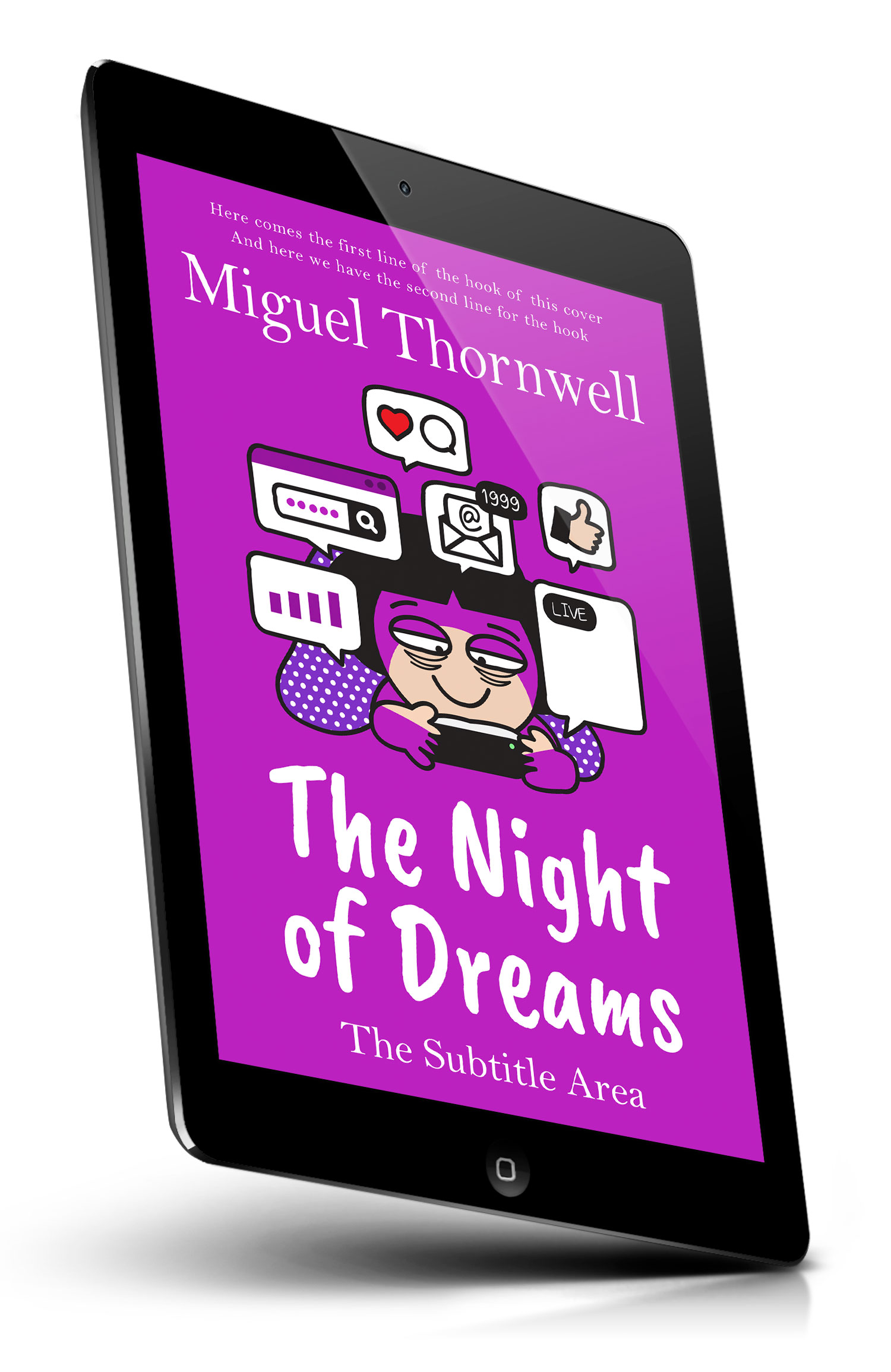 Tags: purple background, cartoon character, smartphone, mobile device, social media, notification icons, speech bubbles, chat message, live streaming, email icon, heart icon, thumbs up, password field, search bar, analytics chart, digital communication, internet culture, late night, technology addiction, modern illustration, premade cover, book cover design, self-publishing, ebook cover, print ready