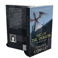 “A dragon flies over a castle wall under a stormy sky. The book cover features the title "Skies of the Dragon" by Timothy Coniglio.”