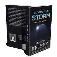 “A sci-fi book cover with a planetary scene and the title "Before the Storm" in large font. Author's name "Ashton Kelsey" is at the bottom.”