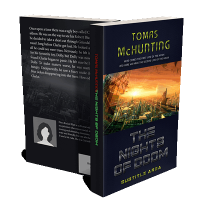 “Futuristic cityscape with glowing skyscrapers, under a dark sky with a circular cutout at the bottom featuring a title.”